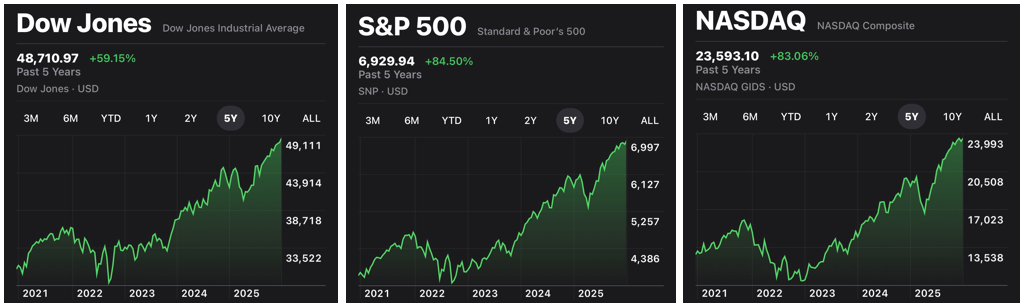 私がアメリカでインデックス投資を始めたのは、2020年9月。ちょうど今年で5年目の節目を迎えました。初めて購入したのは、FidelityのS&P 500連動型投資信託「FXAIX」。この5年間の主要指数の推移はこちら: