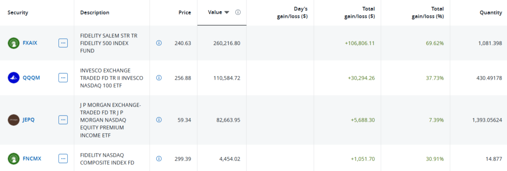 - 2025年の動き:7月に$40,000を初投資し、10月からは月$1,000の買い付けをFXAIXからJEPQに変更。ETFなので自動買い付けはできませんが、手動で約$1,000分を購入しています。