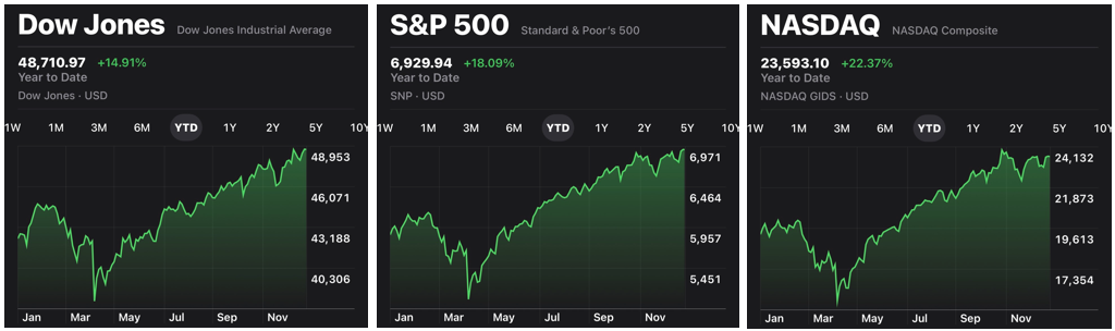 2025年のアメリカ株式市場は、まさにジェットコースターのような一年でした。12月27日時点(市場は29・30日も開きますが)での主要3指数のリターンは以下の通りです: