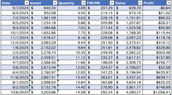 これまでの18回の積立を振り返ってみましょう。合計投資額はSoFiからもらった利息とボーナスのみで、着実に増えています。